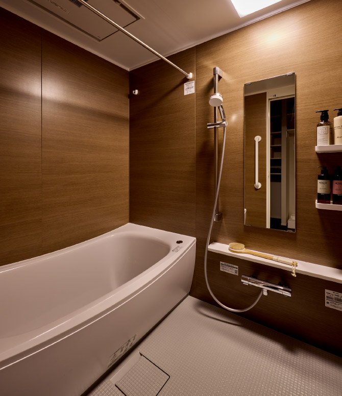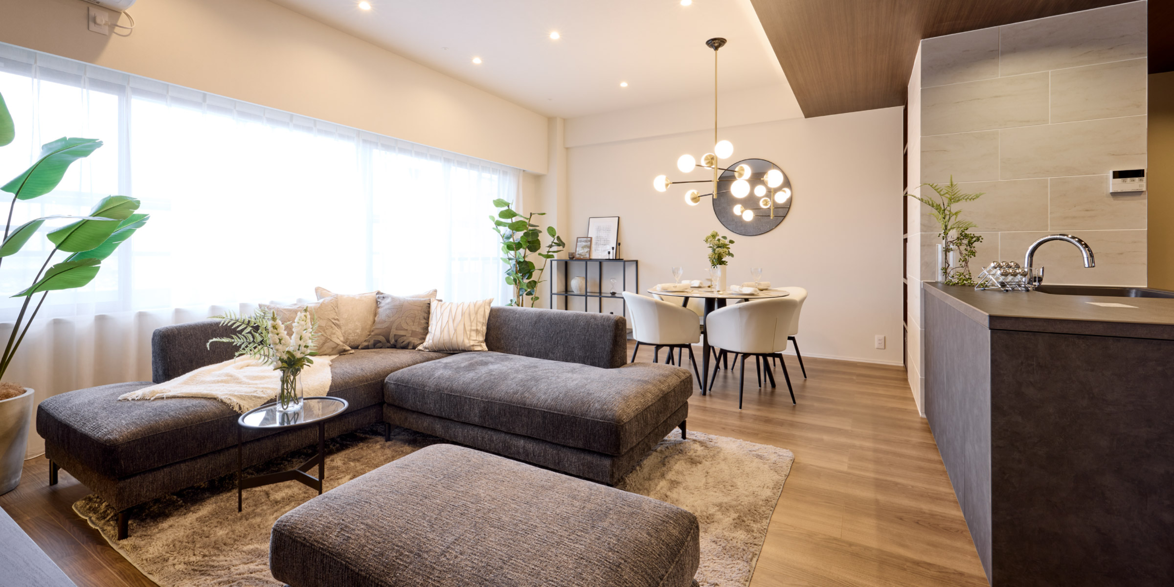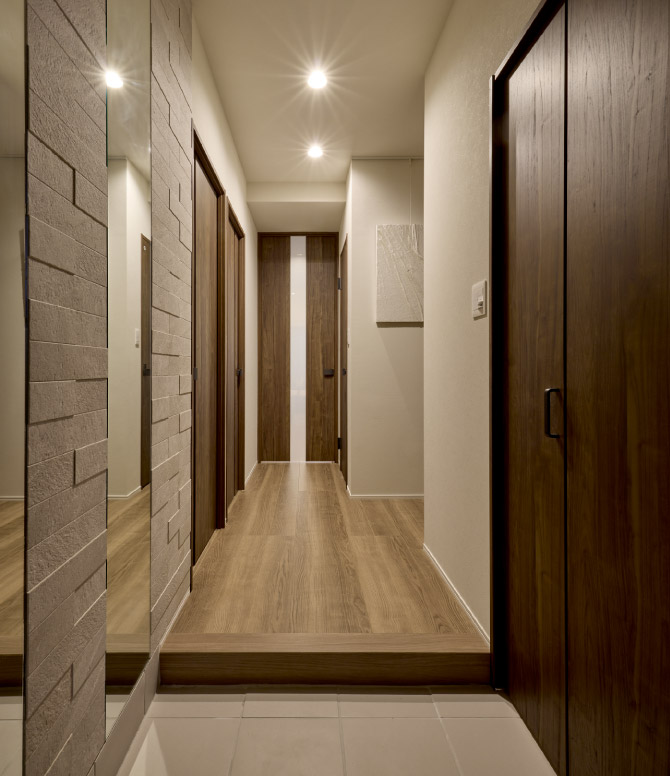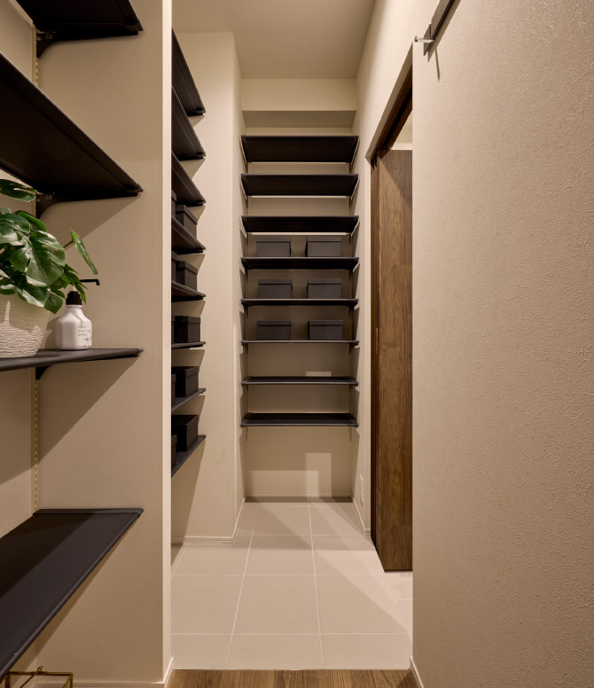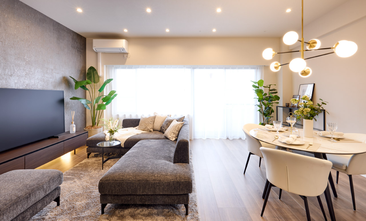 フローリングや壁の一部にダークカラーを配し、奥行きと陰影を生み出した「リュクススタイル」。ホテルライクな空間が、日常に非日常の贅沢感をもたらします。