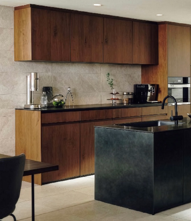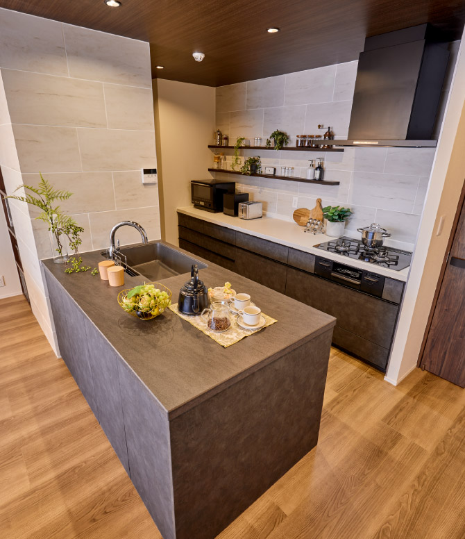 コロナ禍以降、家族で過ごす時間が増えた背景を受け、キッチンは邸の軸に。単なる調理の場ではなく、収納として、ワークスペースとして、団らんや親子学習の場として、多彩な役割を担う舞台へと進化しています。サンリーノでも、キッチンを家族のメインステージとする空間設計を実現。どの居室からもアクセスしやすいように配置し、通過型を超えた“滞在型キッチン”にすることで、キッチンを舞台とした家族の物語を紡ぎ出します。