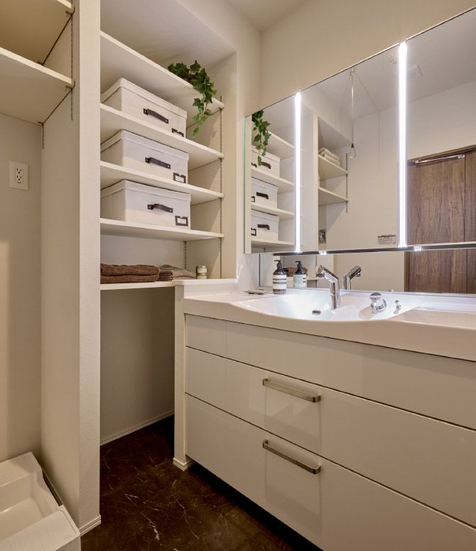キッチンと洗面空間を行き来しやすい、2WAY動線のペニンシュラキッチンをご提案。料理しながら洗濯したり、子供のお風呂を見守ったりできるので、家事効率が上がります。