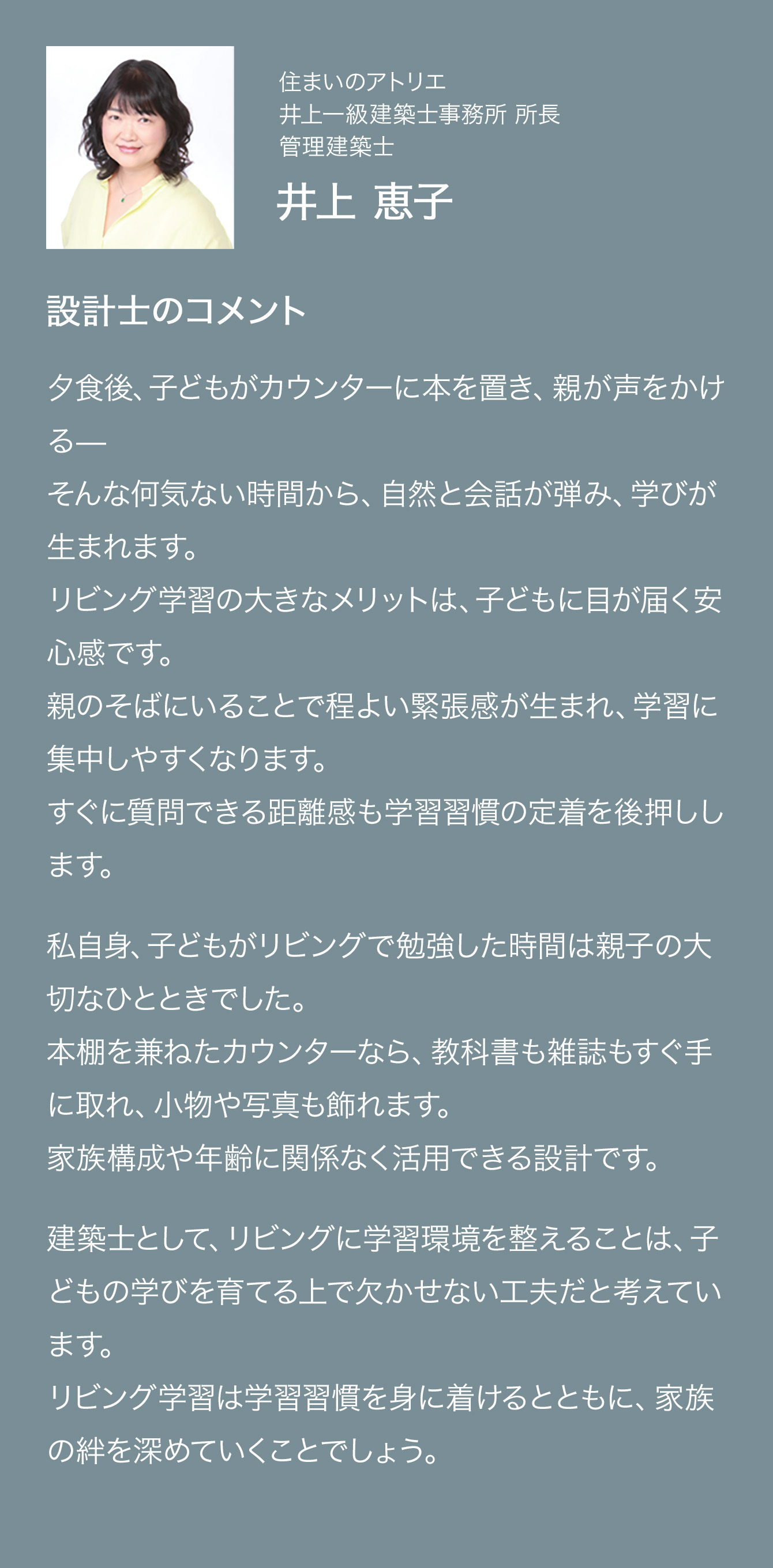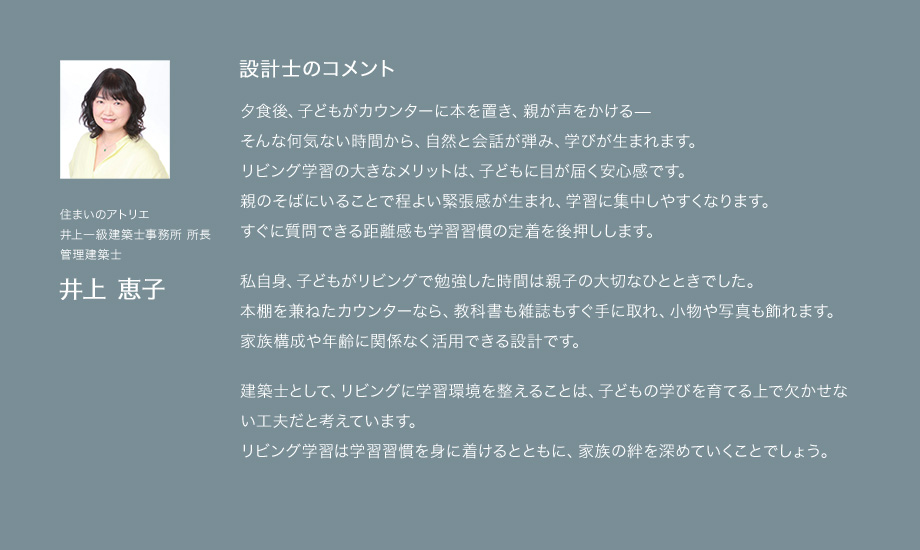 リビング学習の大きなメリットは、子どもに目が届く安心感です。